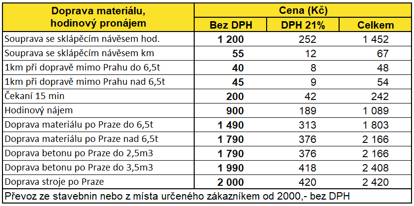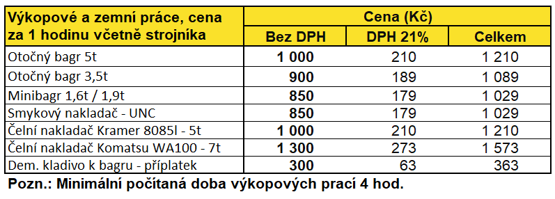 Pozn.: Minimální počítaná doba výkopových prací 4 hod. Uvedené ceny jsou bez DPH a jsou uvedeny včetně strojníka.